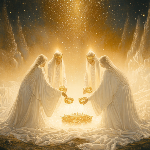 Create a celestial scene with three female figures dressed in white, flowing robes. They are kneeling and bowing deeply in reverence, facing towards the right side of the image. Each woman is placing a golden crown on a glowing, ethereal surface that resembles a path of light leading towards heavenly thrones in the background. The scene is set in a heavenly atmosphere, with a backdrop of a starry sky. The figures should have white or silver hair, and their expressions should reflect deep humility and worship. The entire image should have a soft, glowing light that enhances the spiritual and divine ambiance, ar 8:5