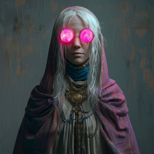 a 35 year old woman with bright white hair and solid pink glowing orbs for eyes, she is wearing a long peasant's dress and shawl --v 6.0