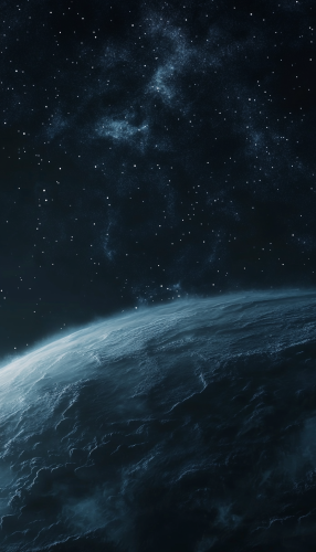 a shot of a vast, starry sky stretching endlessly across the screen. The stars twinkle with a cold, distant light, casting a subtle glow over the dark expanse of space. As the camera pans slowly, a faint shadow begins to emerge on the horizon, gradually taking shape. It’s a mysterious planet, shrouded in a swirling mist of clouds and illuminated by a soft, otherworldly glow. The planet’s surface is partially visible, showing jagged, alien landscapes and deep, shadowy craters. As it slowly rotates into full view, the surrounding stars seem to dim, as if this celestial body commands their attention, drawing the viewer into the unknown. --ar 4:7