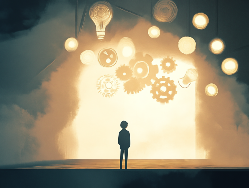 Generate a digital art for Digital art of a person standing confidently on a stage, facing an audience, with thought bubbles showing gears and lightbulbs to represent critical thinking and clear communication. The background is a soft white color, and the scene is illuminated with a spotlight effect. --ar 4:3 --quality .5