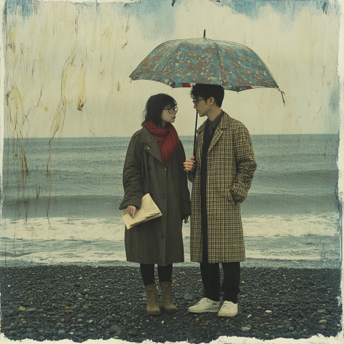 The image depicts two individuals standing together on a beach or rocky shore under a cloudy sky, suggesting a setting that may be during rainfall. They are facing each other, creating an intimate atmosphere. One person, on the right, is holding an umbrella that shelters both from the rain, dressed in a long checkered coat, dark pants, and white shoes. The person on the left is wearing a dark coat and a red scarf, along with glasses, and is holding what appears to be a book or journal. The background features the sea and horizon, enhancing the serene mood of the scene. Overall, the image conveys a sense of closeness and shared experience amidst a natural setting.