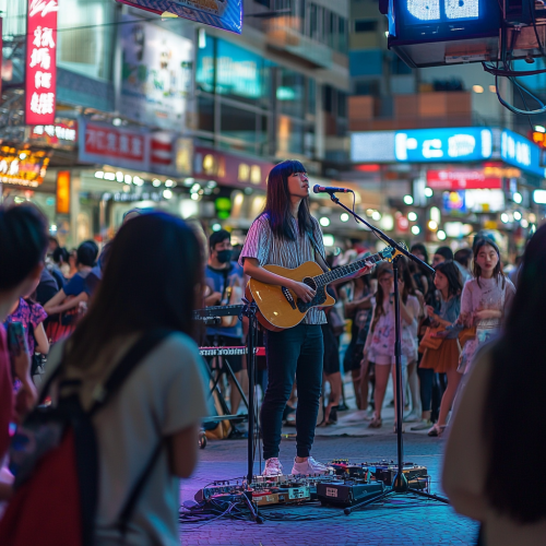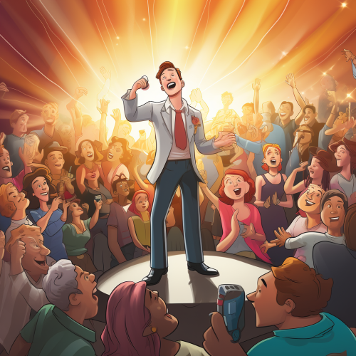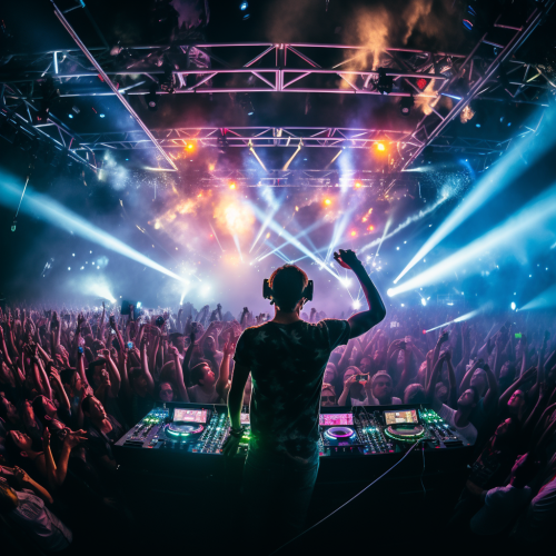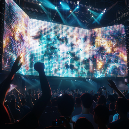close up shot of a digital stage with some people cheering around semi realistic