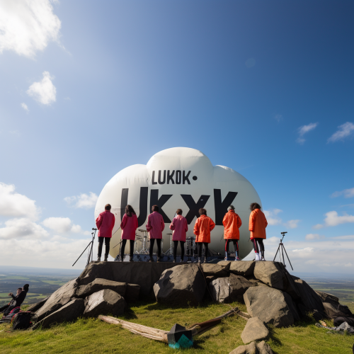 a photo of a band, young people, seen from a distance standing on top of a unnaturally large sign made of rock saying "UOK" --style raw