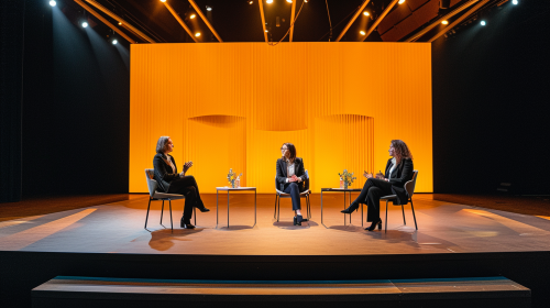 3 people seated having a debate in a huge stage in a auditorium with a digital plain yellow led screen behind them, professional photography --ar 16:9 --v 6.0