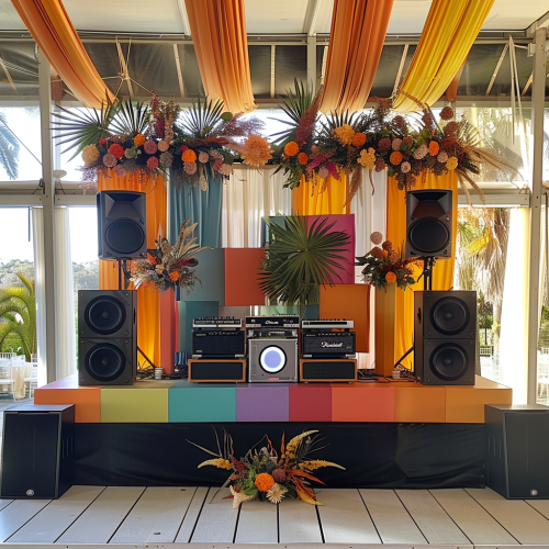 a dj stage design for a day event in sydney with speakers either side and decorations on the table