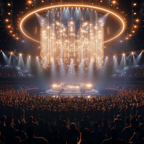 a empty stage with swarm of people cheering in front photorealistic ultra 4k