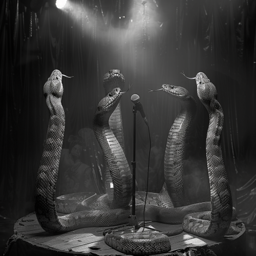 Five king cobras stand on an ancient, wooden cabaret stage, reminiscent of a 70s rock club, under focused spotlights. One cobra is in front of a microphone, poised as if to perform. Render this scene in striking black and white to highlight the rich wooden textures and create a dramatic, vintage atmosphere. The photo, viewed from the audience's perspective, should capture the cool, rough essence of a 70s performance, with the cobras exuding mysterious charisma.