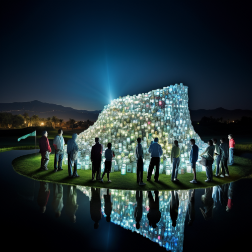 A bunch of people standing on a floodlit golf course, in the style of giant money sculptures, geoff johns, moosa al halyan, queencore, high quality, letterboxing, rim light