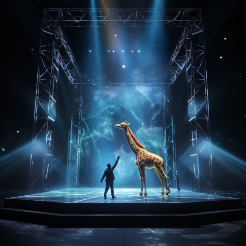 hologram giraffe standing on a stage, actors doing gymnastics around it, theatre, play