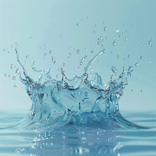 An artistic depiction of an elegant water splash with a soft light blue backdrop. The water splash is graceful and dynamic, with droplets catching the light and creating a beautiful, delicate effect. The background is a gentle light blue that complements the water splash. Lighting emphasizes the movement and texture of the splash. Created Using: Artistic style, dynamic splash, light blue background, delicate lighting, hd quality --v 6.0