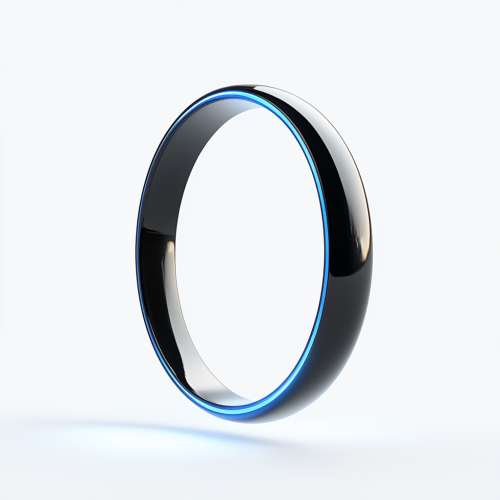 A side rendering of a sleek, black ring hovering in the air against a white background with no shadows. The plain black ring emits a soft, sky-blue glow.