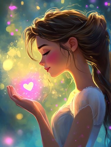 Create a Disney Princess from profile with brown hair and eyes, heart from little pink light in her hand, background should be turquoise blue and yellow, purple, pink, magenta, blur light, very colorful, very cute magical forest blue. --ar 3:4 --v 6.1