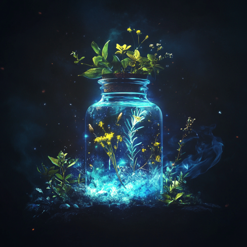 A dark, black background with a blue gradient light glowing from the center. Floating key natural ingredients like herbs and oils shine in blue light, creating a futuristic and sleek scene. Subtle yellow details highlight important elements, keeping the colors minimal and modern.