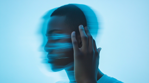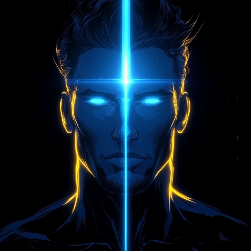 A sleek, dark black background with a glowing blue gradient light from the center, illuminating a male figure with strong, healthy hair. The man is looking confident and vibrant, with light reflecting off his hair to symbolize growth and vitality. A bright, shiny light in the middle adds a futuristic feel, with a subtle yellow accent in the corner matching the sleek design