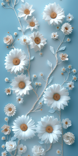 field of felt daisy flowers and vines, light blue background, embroidery pattern, detailed, 3d, seamless pattern, repetition, intricate embellishments, neatly arranged, background details --ar 1:2 --stylize 250 --v 6.0