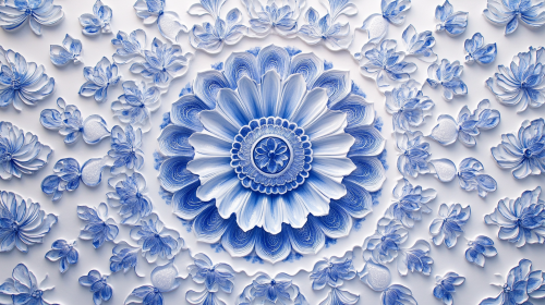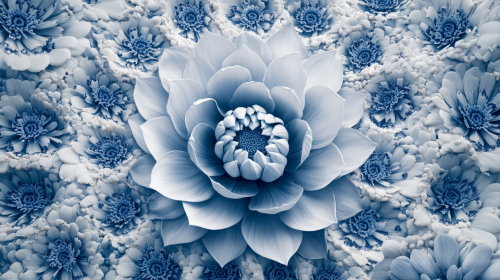 A neat background of light gray, numerous traditional lotus patterns in blue are sucked in a circle from the outside to the middle, getting smaller and darker from the outside to the inside --ar 16:9