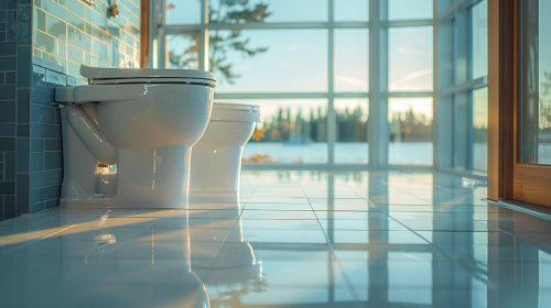 Photo shoot of two toilets, on an An award winning coastal interior design bathroom, lighter tones in shades of blue, green, beige and white to communicate a relaxed feel, the light reflecting off the water create a soothing ambiance, with large windows, lots of light, zen-inspired, bright scene, quiet contemplation, cinematic sets, very illuminated, Vancouver school, bauhaus, light-filled scenes, modern accents, 32K, 35mm focal length, --ar 16:9 --v 6.0 --s 250