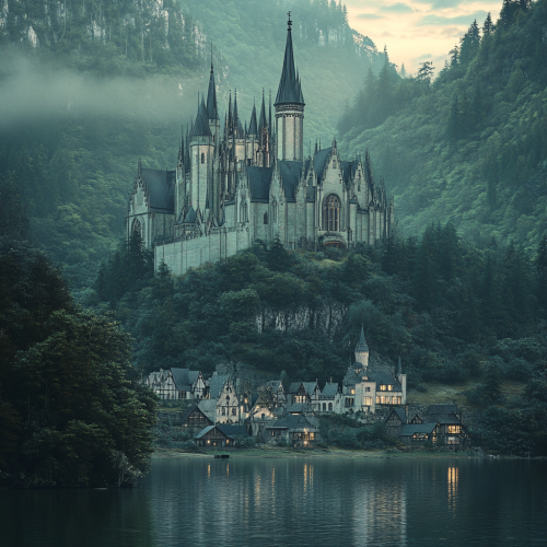 Design a majestic, ethereal castle perched on a large hill surrounded by misty forests and a serene lake. The castle should have tall spires, intricate gothic architecture, and appear to glow softly in the pale light of dawn or dusk. Below, a tranquil village with small houses rests by the water, and the landscape is filled with lush, rolling hills and a peaceful, fantasy atmosphere. The scene should evoke a magical, otherworldly kingdom set in a dreamlike, soft atmosphere.