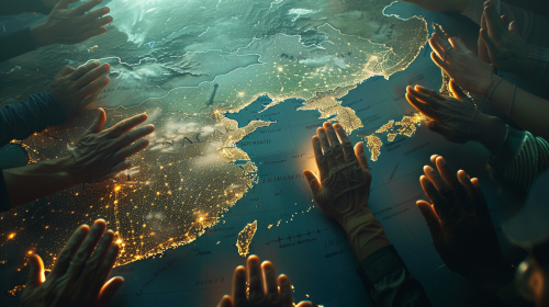 dramatic scene with a dark, moody lighting, featuring a map of the Korean peninsula prominently in the center. Surrounding the map, people from various backgrounds are standing together, holding hands in a united gesture. Above them, a radiant cross glows with a bright, warm light, symbolizing hope and faith. The contrast between the dark surroundings and the glowing cross creates a powerful, inspirational atmosphere. The overall composition highlights unity and spiritual connection in the quest for peace. --ar 16:9 --v 6.0