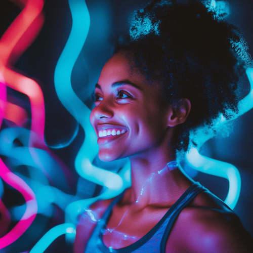 A person smiling during a workout, surrounded by abstract, glowing endorphins flowing around them, symbolizing the joy and mental clarity brought on by physical activity.