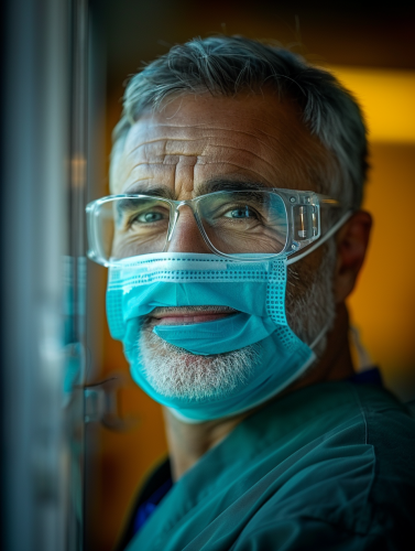 male nurse in practice, 45 years old,smiling in mask. Canon camera with an aperture of 5.2, He looks in the mirror which is on the side of the camera --s 500 --c 10 --v 6.0 --ar 3:4