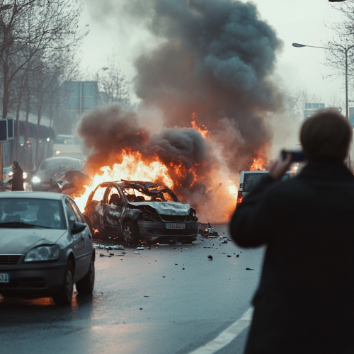 An intense scene depicting a car accident on a road with a fire breaking out from one of the vehicles. In the foreground, a person is quickly leaving the scene while using a mobile phone to call emergency services. The background shows smoke and flames rising from the car, and there's a sense of urgency and caution. Other vehicles are stopped at a distance, and some people are looking on cautiously from afar. The setting is a typical European road with clear signage and road markings.