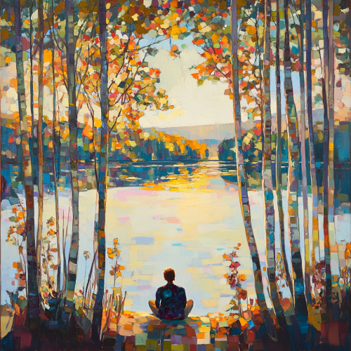 Create a realistic painting of a person sitting peacefully by a lake, nestled between tall, slender trees. The sunlight filters through the leaves, casting soft golden hues on the scene. The reflection of the trees and sky shimmers on the water's surface. The overall composition is in the style of Kandinsky, incorporating subtle abstract elements in the shapes of the trees and the interplay of light, with vibrant geometric forms dancing around the edges of the natural scene, blending soft curves with sharp, dynamic lines.