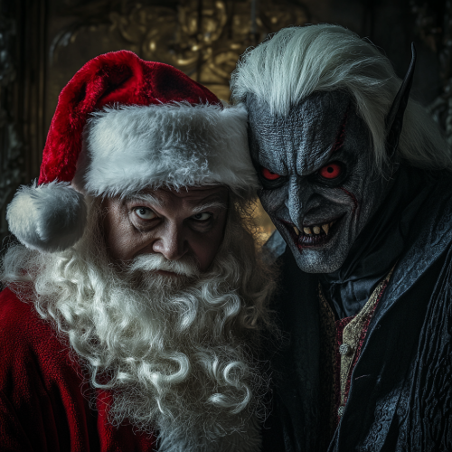 Ultra-realistic, highly detailed photo of Santa Claus and Dracula, real photo, intricate details. The photograph is taken with a Canon EOS 5D Mark IV, using a Canon EF 50mm f/1.8 lens, 4k --v 6.1 --style raw