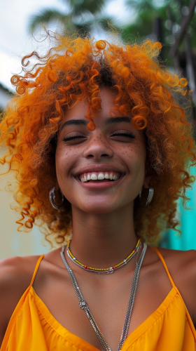 portrait of a smiling person after making an easy decision. Canon camera with an aperture of 5.2 . Orange hues. Bright environment --s 300 --c 15 --v 6.0 --ar 9:16