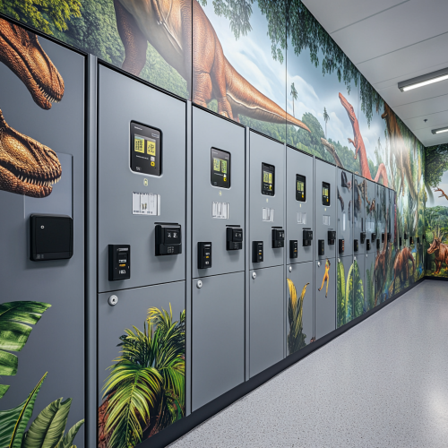Imagine a photorealistic image of banks of RFID-enabled lockers embedded in a wall. The lockers are seamlessly built into the wall, with sleek, modern RFID panels in the doors of the lockers. There are dinosaur themed murals on the wall. Use a high-resolution camera with a 16:9 aspect ratio to capture this detailed and immersive scene. –ar 16:9 –v 5.2 –style raw –q 2 –s 750.