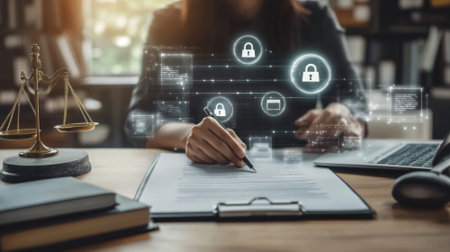 Create a photorealistic image representing data protection law. Show a legal document or contract on a desk with a padlock symbol and privacy icons hovering above it. A lawyer is sitting at the desk, reviewing the document with a pen in hand. The setting is a professional office, with law books, a scale of justice, and a laptop open to a legal webpage in the background. The atmosphere is serious, emphasizing trust, privacy, and legal expertise in data protection. --ar 16:9 --v 6.1