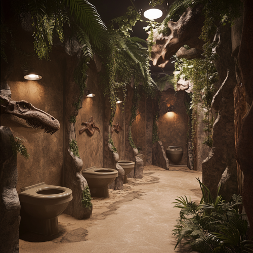 Imagine a photorealistic image of themed public toilets in a dinosaur-themed waterpark. The scene should capture the unique atmosphere created by ambient lighting and artificial rock formations. The toilet cubicles with doors, are designed to blend seamlessly with the prehistoric theme, featuring faux dinosaur bones and fossils embedded in the walls. Lush artificial plants and vines drape over the rock structures, adding to the jungle-like ambiance. The lighting is soft and warm, casting gentle shadows that enhance the natural look of the surroundings. The floor is designed to resemble a sandy terrain, completing the immersive experience. Use a high-resolution camera with a 16:9 aspect ratio to capture this detailed and atmospheric scene. –ar 16:9 –v 5.2 –style raw –q 2 –s 750
