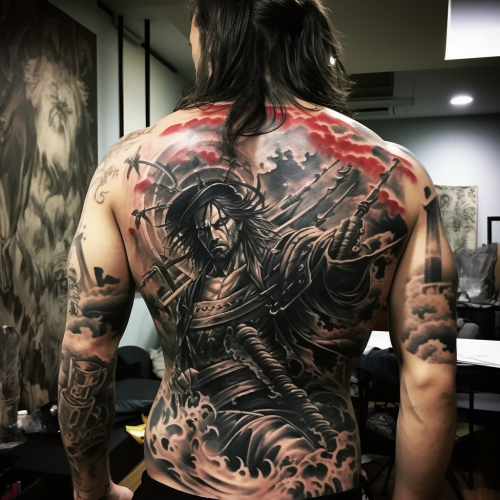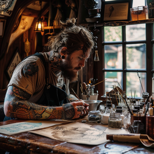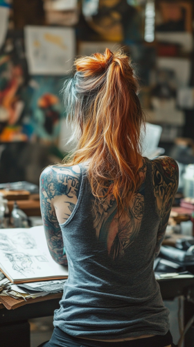 Woman tattoo artist designing in sketchbook, sleeve tattoos visible, industrial studio space, artistic mess of materials, gothic-chic style, shot from behind --ar 9:16 --style raw --s 250