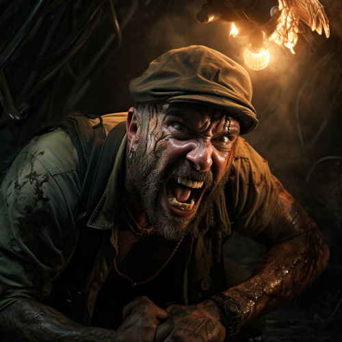 realistic, horror, contrast, a middle aged Tattoo artist from the 90' smiles holding his tattoo macheine, overgrown, wet cave. he is fighting heroically yelling a war cry. the muzzle flash lights up the cave. He is wearing a sherriff's hat and badge. there are vines and glowing eyes in the darkness. He is dropping bullets as he fights --s 250 --v 5.2