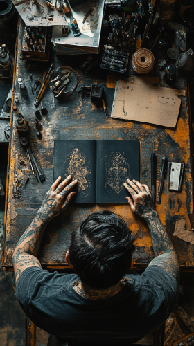 Tattoo artist's hands sketching in black book, sleeve tattoos visible, shot from above looking down at sketchbook, industrial studio space, artistic mess of materials --ar 9:16 --style raw --s 250
