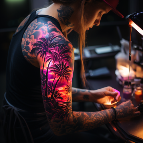 tattoo artist in dark room tattooing palm trees on a woman's arm. the light is focused on the tatoo and the view is from someone standing next to the tattooer --s 250 --v 5.2