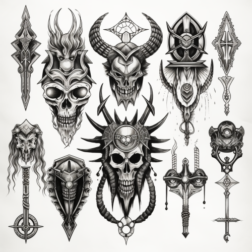 drawing tattoo flash medieval. Only sketches no colour. Bold lines