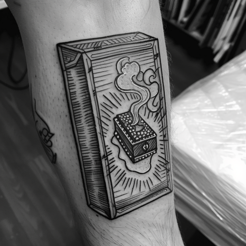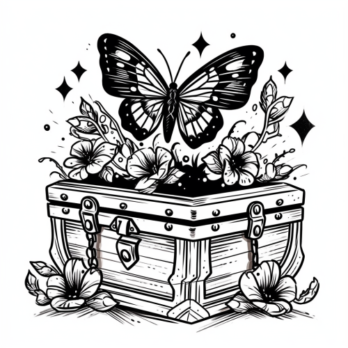treasure chest open and empty with moths inside, American traditional tattoo, old school, Western traditional, classic tattoo, Sailor Jerry style, vintage tattoo, traditional tattoo, vintage style, simplified, simple, bold black outlines, limited color palette, lots of shading, single tattoo, single design, tattoo flash, flash art, inked, light background --niji