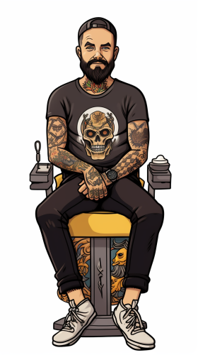 [f34af3e4a] Cartoon tattoo artist, around 40 years old, with a beard, Asian, facing forward, sitting on a golden emperor's chair, simple background, white, looking at the camera, high definition, half-body portrait --no 手 --v 5.2 --ar 9:16 --c 0 --style raw
