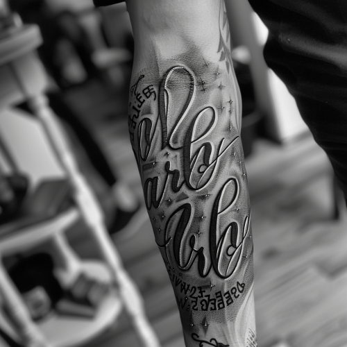 fine line tattoo for men, on ribs, ad some blue and some lettering