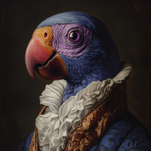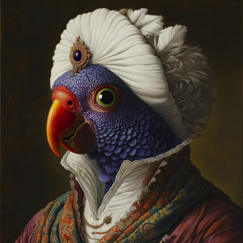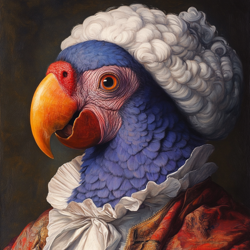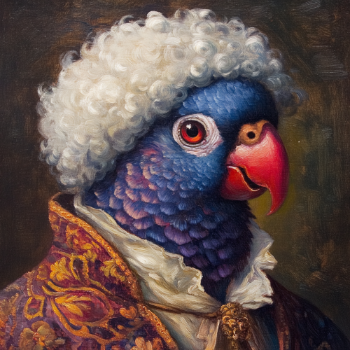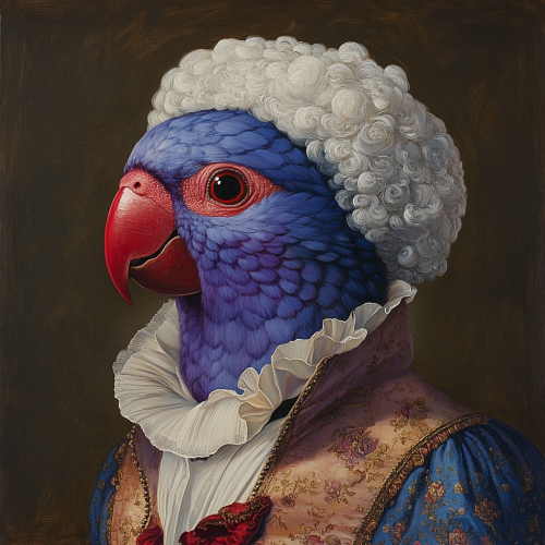 18th century oil painting portrait of a human with the head of a blue and purple Indian ringneck parrot, featuring a bright red beak. The figure is wearing a traditional white curly wig, and a silk detailed cloth, detailed in the style of classical portraiture with rich, realistic textures and soft lighting.
