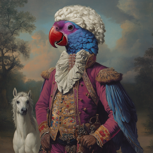 18th century oil painting portrait of a human with the head of a blue and purple Indian ringneck parrot, featuring a bright red beak, green eyes with yellow around the eyes. The figure is wearing a traditional white curly wig, and a silk detailed cloth, detailed in the style of classical portraiture with rich, realistic textures and soft lighting. realistic, high resolution, He is hunting and standing infront of his great white horse