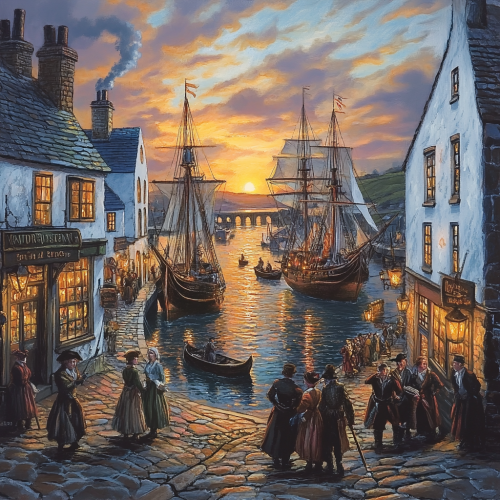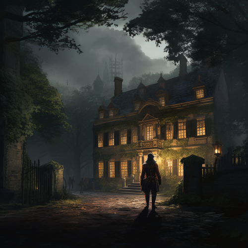 A concept art-style illsutration featuring an 18th-century English manor house and a yong noble in front of us (we see his face) peering the outside through a window.