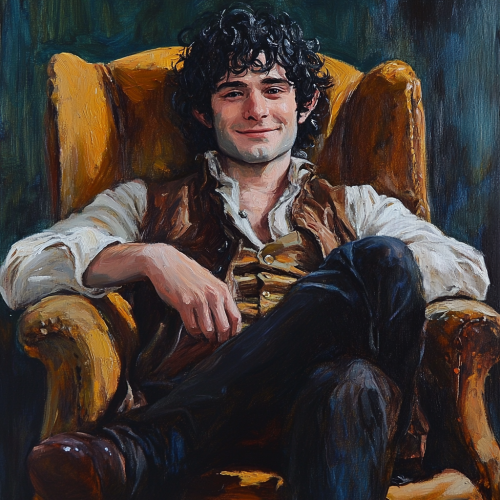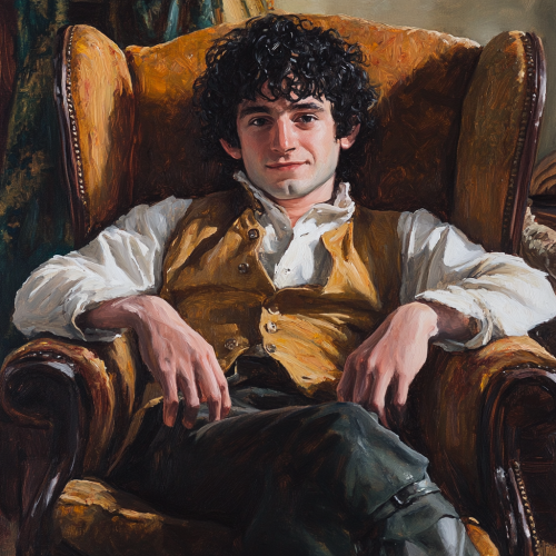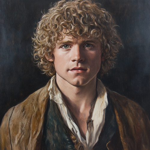 a fair-haired curly haired samwise gamgee heavy-set hobbit from lord of the rings Tolkien The hobbit oil painting oil portrait painting brush strokes in 18th century clothing and style in oils 3/4 portrait art in frame