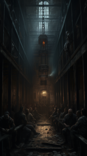 Create a highly realistic image, styled like a film still from a historical movie, depicting a prison built in 18th-century Morocco with incarcerated prisoners. The image should be crafted with photographic realism, ensuring there are no awkward elements. Focus on the bleak and confined atmosphere of the prison, highlighting the chains binding the prisoners to convey their lack of freedom. Each prisoner should be portrayed with details that reflect their individual stories and the harsh conditions of their confinement. The architecture of the prison should be typical of 18th-century Moroccan design, with attention to historical accuracy in its construction and layout. The overall composition should evoke a sense of despair and hopelessness, capturing the grim reality of life in an 18th-century Moroccan prison, --ar 9:16 --stylize 250 --v 6.0