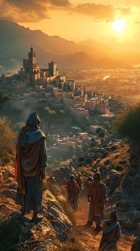 Create a highly realistic image, styled like a film still from a historical movie, depicting Ismail and his army looking at 18th-century Morocco from a distant hill at noon, with the sun high in the sky. The image should provide a comprehensive view of the entire village and the royal palace. Ensure that the image is crafted with photographic realism, with no awkward elements. Focus on capturing the grandeur of the Moroccan landscape under the midday sun, along with the impressive sight of Ismail and his army. The perspective should be from a high vantage point on a hill, allowing a panoramic view that includes the intricacies of the village life, the majestic palace, and the formidable presence of the army. Attention to detail in the attire of Ismail and his soldiers, the architectural features of the buildings, and the natural surroundings is crucial. The overall composition should not only capture the strategic scene of Ismail observing Morocco but also the vibrant and historic essence of 18th-century Morocco, --ar 9:16 --s 250 --v 6.0