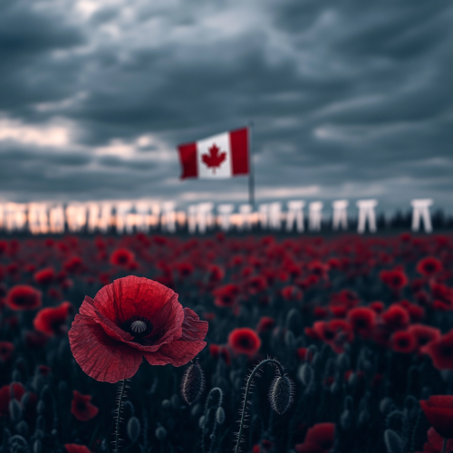A solemn Remembrance Day scene inspired by In Flanders Fields, capturing a quiet field of red poppies under a soft, cloudy sky. In the background, rows of white crosses stand in neat lines, symbolizing fallen soldiers, with a Canadian flag gently waving in the breeze. The lighting is soft and respectful, with hints of dawn or sunset to convey hope and remembrance. A single poppy blooms close-up in the foreground, rich with vibrant red, symbolizing resilience and memory. Style: realistic and respectful, with muted, earthy tones and a calm, reflective atmosphere. Perfect for honoring Remembrance Day in Canada.