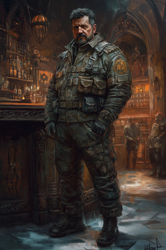 a full body shot of a male grimdark government administrator. He wears scruffy grimdark uniform. In the background is a gothic grimdark bar. digital painting --ar 2:3 --v 6.1 --no marine