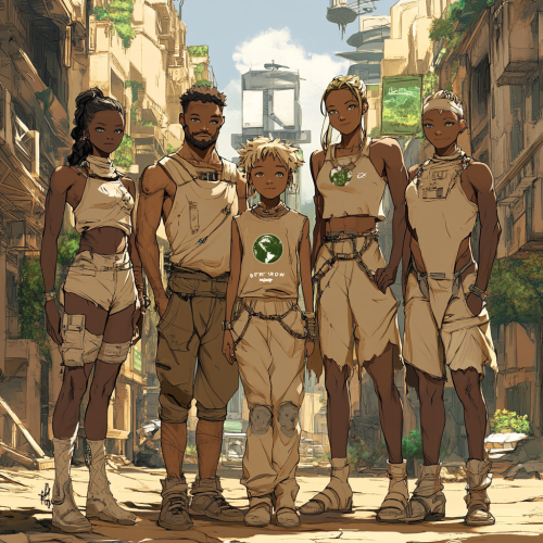 an ecologic urban community in a cyberpunk world. There are 5 people with different age and skin colors. The symbol of the tribe is a Earth. They wear beige outfits with the symbol of the tribe. Background is a tropical city.