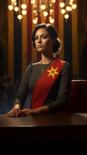 female government official in Barcelona sitting in the state office, realistic, photography, --ar 9:16
